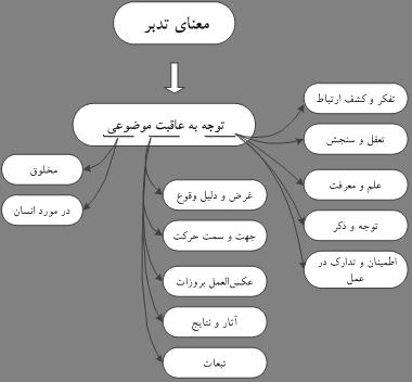 همچنین با قوّه تدبر، انسان میتواند غرض پدیدار شدن چیزی را مورد بررسی قرار داده، ارتباط آن را با غایت و عاقبت خود بسنجد[3] که معنای این واژه در نمودار زیر به طور کامل نمایش داده شده است.